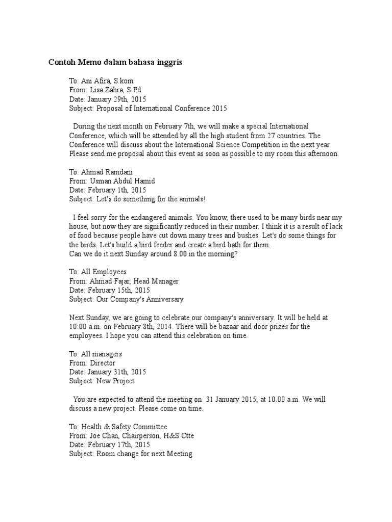 Semoga bermanfaat bagia anda artikel contoh membuat memo dengan bahasa inggris ini. Next post 4 contoh percakapan dalam bahasa inggris menanyakan arah tempat dan tujuan. Pesan singkat ini sangat sederhana. Mr.lukito is a manager in a company located in semarang. Dalam penulisan memo anda bisa menggunakan bahasa yang singkat dan jelas sehingga pernrima bisa memahami apa yang anda maksudkan.